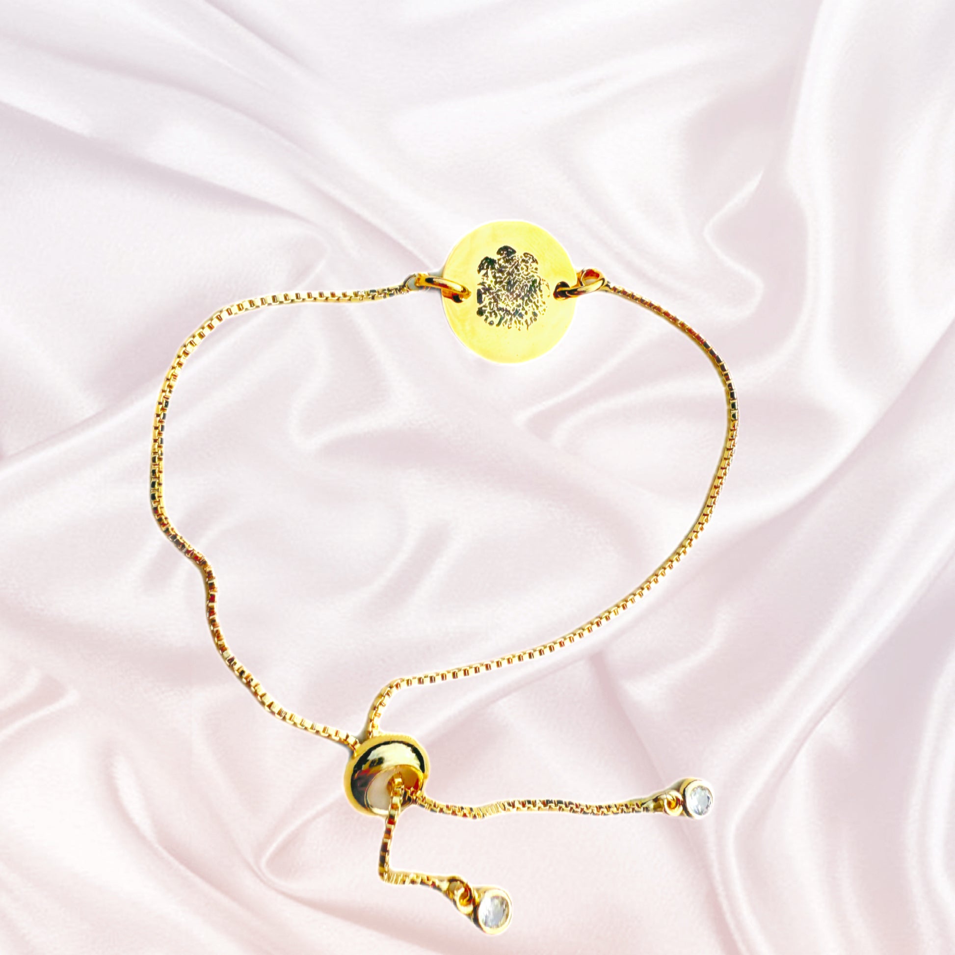 Double sided bracelet with elephant foot print on one side and an elephant trunk kiss on the other, with adjustable chain.